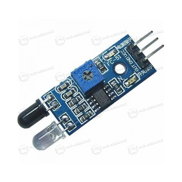 ИК (инфракрасный) датчик препятствий интегрируется в роботов, построенных на платформе Ардуино. Эффективная дальность действия составляет 2-30 см. С помощью датчика робот сможет лучше ориентироваться в пространстве, не врезаться в препятствия и составлять карту помещения. На модуле размещены приемник и передатчик. Передатчик формирует инфракрасный сигнал, затем он отражается и поступает на приемник. В результате полученных измерений устройство принимает решение о дальнейшей стратегии действий и направляет робота в соответствии с ней. Заданный диапазон обнаружения можно отрегулировать с помощью подстроечного резистора.